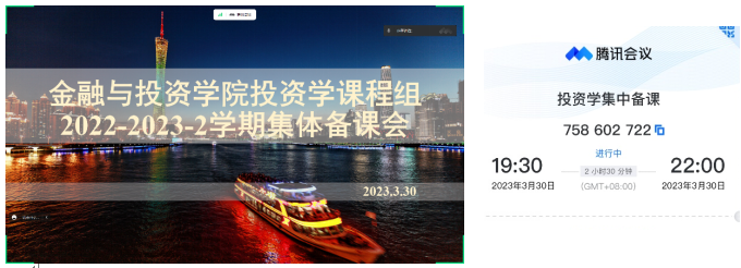 2023年3月30日晚上七点半,云顶国际投资学课程组通过腾讯会议举行了线上集体备课会,公司副经理孙进军副教授、投资系主任胡妍博士、投资与金融工程两系教师汤洪波教授、黄伟麟教授、吴辉凡副教授、龙安芳博士、廖婧琳博士、彭俊华博士、李琰钰博士等16人参加了本次备课会。