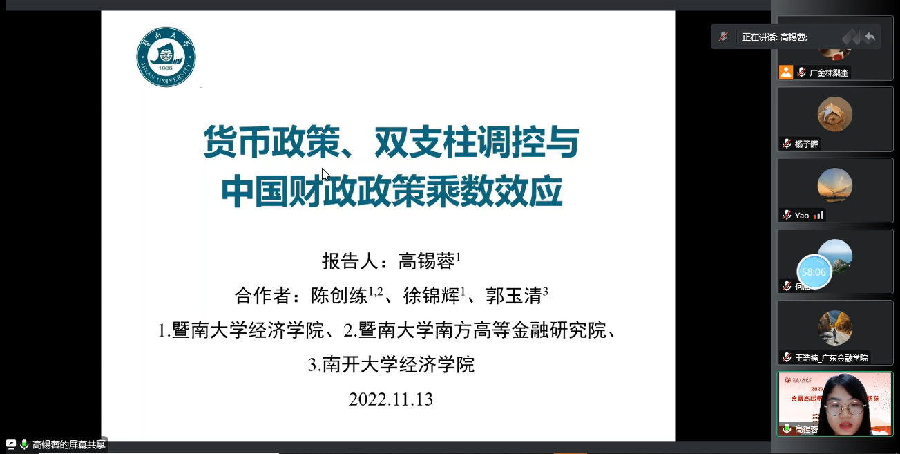 高锡蓉博士为参会听众分享了题为《货币政策、“双支柱”调控与中国财政政策乘数效应》的最新研究成果。文章通过构建一个符合中国实践的动态随机一般均衡模型,并在模型中嵌入家庭、企业和政府部门,从模型系统中考察不同类型财政政策的乘数效应,特别是,围绕中国的渐进式改革和双支柱转型,阐述如何有效提质增效财政政策效果,以期为未来中国宏观调控政策的改革与执行以及财政政策的提质增效路径提供重要的决策参考依据。胡小文教授随后进行了精彩点评。