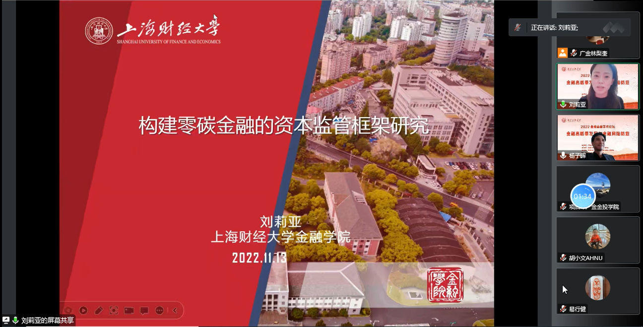 刘莉亚教授为参会听众分享了题为《构建零碳金融的资本监管框架研究》的最新研究成果。研究成果基于双碳目标、绿色金融、零碳金融、绿色信贷等战略背景,以及巴塞尔协议的演变及其对零碳金融的约束等研究背景,提出如何推进零碳金融的资本监管框架实践、零碳金融的资本监管对绿色信贷的数量与价格的影响多大、零碳金融的资本监管对实体经济的影响如何、零碳金融的资本监管对棕色及传统行业的溢出效应多大、在逆周期资本监管中纳入零碳因素的效果如何等一系列问题,并制定研究方案,分别从差异化资本监管对绿色信贷发放及定价的影响、识别差异化绿色资本监管的实体经济效应、识别差异化资本监管对棕色和传统行业的溢出效应等方向进行实证研究,以及纳入零碳因素的逆周期资本监管建立宏观模型、进行政策模拟。杨子晖教授随后进行了精彩点评。