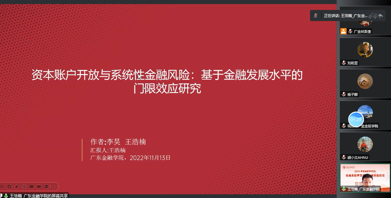 王浩楠博士为参会听众分享了题为《资本账户开放与系统性金融风险:基于金融发展水平的门限效应研究》的最新研究成果。文章从金融发展水平视角出发,考察资本账户开放与金融发展水平差异对系统性金融风险的影响及其门限效应,针对资本账户开放的不同渠道研究其对系统性金融风险的影响差异。并从金融市场发展和金融机构发展水平两个角度,解释金融发展水平差异对于系统性金融风险的内部影响机制,研究表明相对于金融市场发展,金融机构发展水平的提升具有更加显著的抵御系统性金融风险作用。文章还进一步考察资本账户开放下宏观审慎政策对系统性金融风险影响,认为在当前情况下,加强宏观审慎管理,抑制信贷过分增长对于进一步扩大金融开放是有利的,从而能够为未来央行制定与执行宏观审慎管理提供重要的决策参考依据。何康博士随后进行了精彩点评。