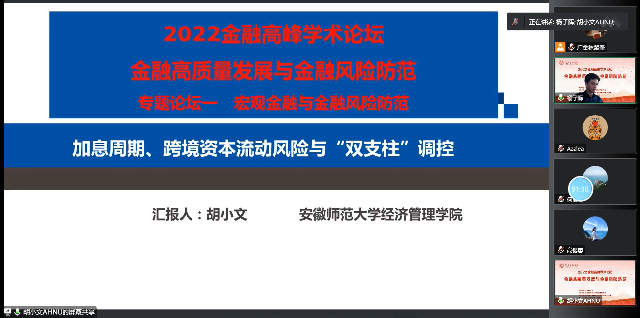 胡小文教授为参会听众分享了题为《加息周期、跨境资本流动风险与“双支柱”调控》的最新研究成果。文章构建一个包含跨境资本流动的动态随机一般均衡模型,系统研究美联储加息冲击下,跨境资本流动的“双支柱”政策协调。研究发现,美联储加息时,“以我为主”的货币政策在应对美联储加息时的效果要明显优于“竞争性”加息;跨境资本宏观审慎政策与货币政策的最优组合是货币政策盯住国内产出和通胀波动、跨境资本宏观审慎政策盯住跨境资本流动;“双支柱”政策实施过程中,需要避免出现政策叠加,以及要警惕跨境资本宏观审慎政策力度过大会增大社会福利损失。因此,针对国外加息的跨境资本冲击,应采用宏观审慎政策管理,同时货币政策要坚持“以我为主”。高锡蓉博士随后进行了精彩点评。