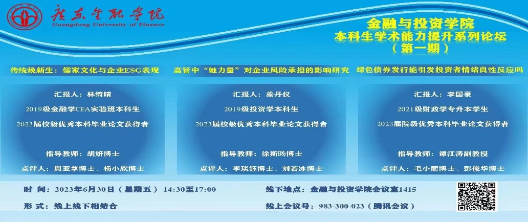 为了贯彻以员工发展为中心的教育理念,实现全员育人、全程育人、全方位育人,推动人才培养质量再上新台阶,2023年6月30日下午,公司举办了首期本科生学术能力提升系列论坛,来自2023届金融学、投资学与财政学专业的三位本科生分别汇报了各自撰写的校级或院级优秀本科毕业论文,并由六位博士分别进行点评。