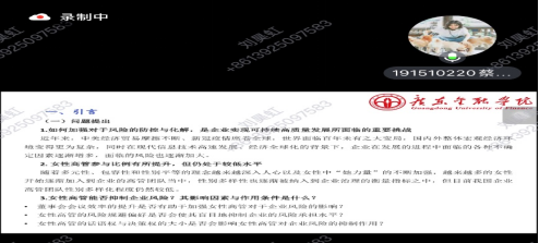 第二位汇报人是来自2019级投资学专业的蔡丹仪同学,她汇报了题为《高管中“她力量”对企业风险承担的影响研究》的论文,文章讨论了女性高管参与对企业风险承担的影响,以及董事会会议效率在二者关系中的调节效应。文章还进一步基于企业风险承担水平、女性董事、产权性质、企业规模、所属行业、市场化程度等视角进行了异质性分析。文章为我国企业高管团队中性别结构的改革与优化提供了一定的理论依据与现实指导。在点评环节中,李琰钰博士肯定了这篇论文的研究意义,并从理论与机制分析、内生性处理等方面提出了修改建议。刘若冰博士建议考虑高管的具体职位差异,并补充说明对于高科技与非高科技公司的划分依据。