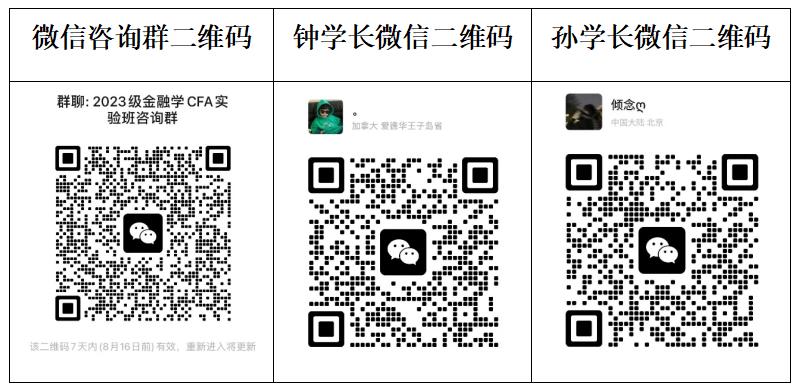 为了方便有意报考公司2023级金融学CFA实验班的新生了解相关招生信息与选拔测试流程,云顶国际现开通官方微信咨询群“2023级金融学CFA实验班咨询群”(见下方群二维码),公司教师与在读金融学CFA实验班的学长学姐将入群为广大新生解答相关问题。请各位新生与家长入群后立即查看群公告,有序提问,并修改群昵称为“录取专业+员工真实姓名”,例如“互联网金融张三”或“资产评估李四家长”。当咨询群成员人数超过一百人时,无法直接通过扫码入群,可以添加下方两位学长的微信并由他们邀请进群。
